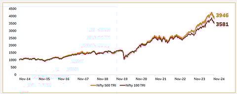 ICICI Prudential Mutual Fund announced the launch of ICICI Prudential Nifty 500 Index Fund, an open-ended index scheme replicating Nifty 500 Index. This scheme is designed to replicate the performance of the Nifty 500 Index. The new fund offer (NFO) allows investors to participate in the growth story of India’s top 500 companies, representing nearly 94% of the nation’s listed universe (Source: Nifty Indices. Nuvama Research Data as on 31st October 2024).