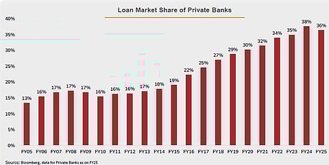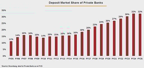 Private banks have shown growth in their share of the Indian credit and deposit markets over the past two decades. Loan market share rose from 13% in FY2005 to 36% in FY2025, and deposit market share improved from 11% to 32% over the same period.