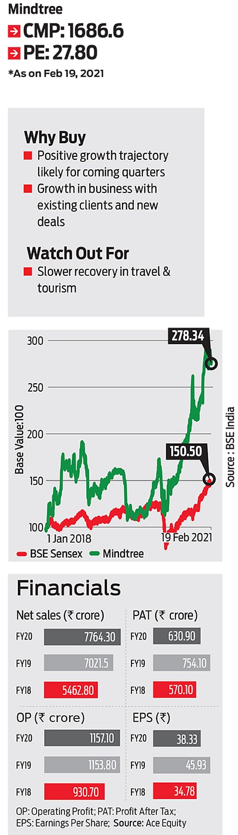 The third-quarter results of Mindtree for 2020-21, proved to be a stellar performance, thanks to its broad-based revenue growth of 5.1 per cent at Rs 2,024 crore across verticals and service lines. Its Banking, Financial Services and Insurance (BFSI) segment rose 0.8 per cent, Communications, Media and Technology (CMT) grew 5 per cent, Retail, Consumer Packaged Goods and Manufacturing (RCM) grew 5.8 per cent and Travel, Transport, and Hospitality (TTH) saw a 13 per cent growth. The management feels these verticals are expected to witness strong growth backed by a robust deal pipeline in the coming quarters. Also foresees a positive outlook for the second half of the financial year 2021 despite some seasonal weakness.