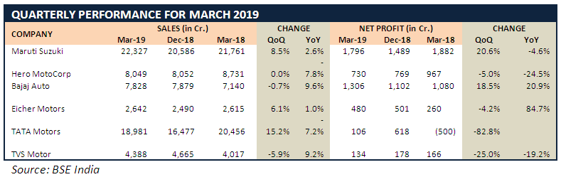 Most of the Auto firms in India had a disappointing March quarter on the back of subdued demand; high fuel prices, higher insurance costs and liquidity squeeze in the economy. The increased ownership cost in addition to stress at the farm level hampered buying sentiment, particularly in 2Ws/PVs segment. Consequently, inventories were at record levels across segments and particularly it was highest in the two-wheeler segment at 60-70 days. Almost all auto companies are facing the issues of high inventory levels across the country, that has forced auto companies to cut production, companies which have cut down on production include big names such as Maruti Suzuki, Bajaj Auto, and Hero Motors. This slow down is directly reflected in auto sector earnings, which have seen sharp declines in profits across the board. Bellwether companies such as Hero Moto Corp, TVS Motor have been worst hit in terms of profitability.