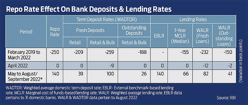 According to the latest bi-annual monetary policy report released in September 2022, between February 2019 and March 2022, the repo rate reduced by 250 basis points (bps). One bps is equal to 0.01 per cent. In the same period, rates on fresh deposits (weighted average for retail and bulk) reduced by 259 bps, while the weighted average lending rate on fresh loans reduced by 232 bps, and the rates on outstanding loans fell by 150 bps. The rate cut on existing loans is much less than the reduction in deposit rates.