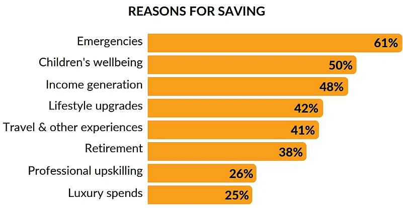 - The top reasons for saving are emergencies (61%), children and inheritance (58%), and lifestyle upgrades (45%).