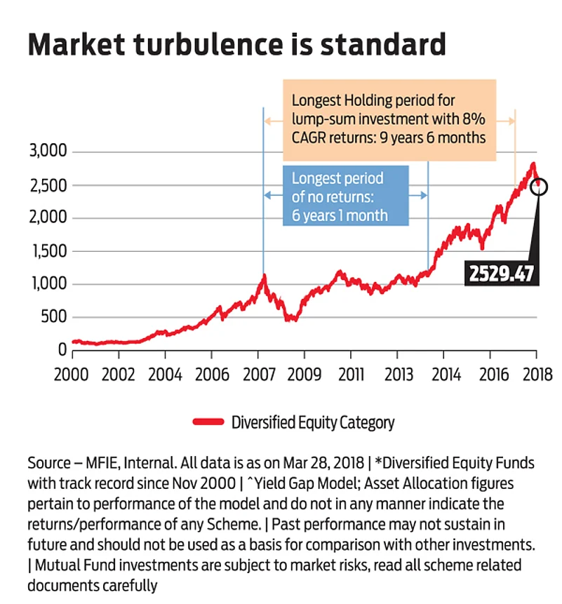 I also warned him about the pitfalls. Investing may not even be half as smooth as the plane ride, even if you invested regularly, let’s say through the most popular route of investing, Systematic Investment Plans (SIPs). I showed him how for long periods SIPs may give low or no returns (like the six year period between 2007 and 2014), and how as equity prices rise over the long term, returns follow. But it takes time.