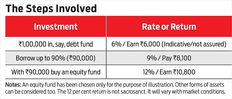 A bank will typically accommodate 80-90 per cent of the asset value and lend you Rs 80,000-90,000. This is usually directed to a loan account, which, for all intents and purposes, operates as a current account with its own cheque book. In other words, you have raised Rs 90,000 or so at 9 per cent against an investment of Rs 1,00,000 yielding 6 per cent. Therefore, at the end of the year, on the one hand, you will earn Rs 6,000, while on other, you will pay Rs 8,100. Simple enough.