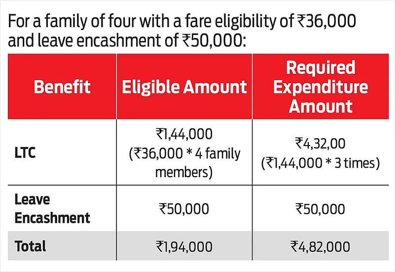 If an employee spends Rs 4,82,000 or more, she will be entitled to receive 100 per cent of the amount, i.e., Rs 1,94,000. Out of this, the portion related to LTC or Rs 1,44,000 will be tax-exempt. It will result in a tax saving of Rs 61,545 at the maximum tax rate of 42.74 per cent. The amount entitled will proportionately reduce if the actual amount spent is lower than the required amount.