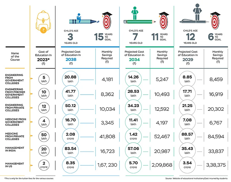 If your child is in school, you can start planning for their education now. We give the corpus you will need when your child turns 18, depending on the course she chooses. We have done calculations for three sets of parents whose child is either 3, 7 or 11. Education inflation has been assumed at 10%, while growth in savings is assumed at 12% for investing tenure of 10-plus years, and 8% for 6 years.