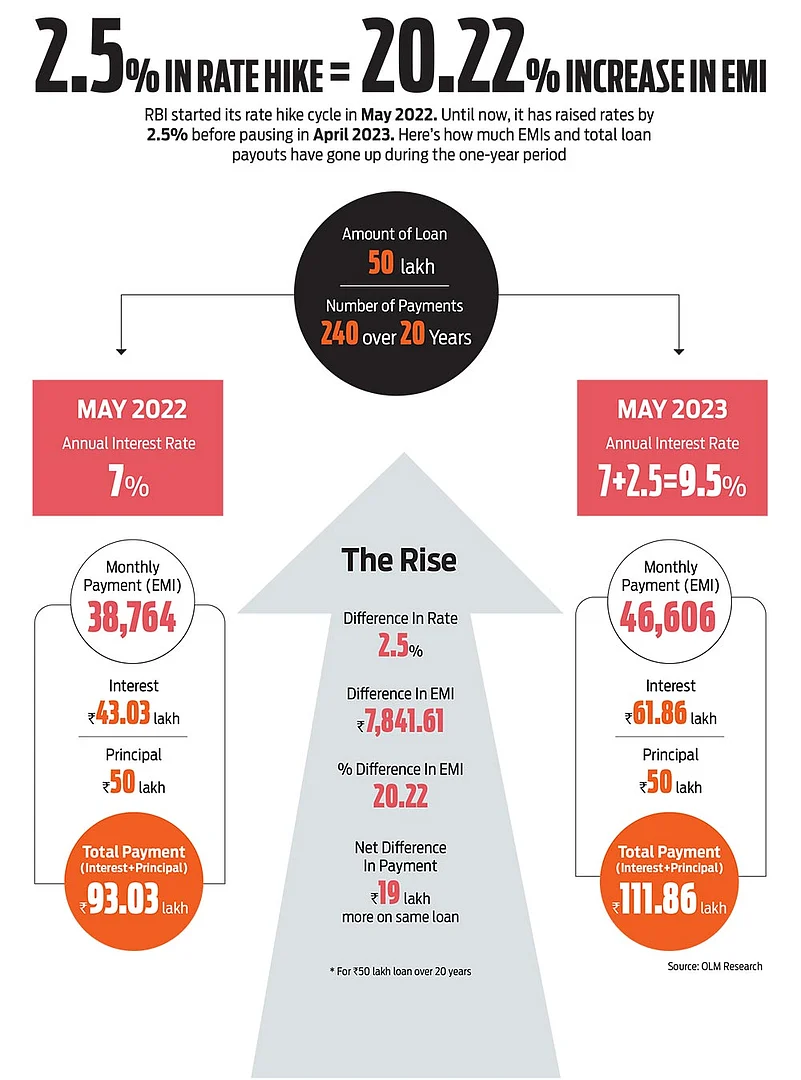 The development throws up key issues for borrowers, both new and existing. The first, of course, is where are the interest rates headed. The second is relevant for new borrowers who may have been waiting for a rate hike pause and would now be wondering if the time is right for them to take the plunge. The third involves existing investors, who need to put a strategy in place if they haven’t done so already, especially now that they may not have to realign their cash flows every two months with every RBI monetary policy announcement. Before dealing with those, we take stock of the pain the rate hikes have caused over the past year.