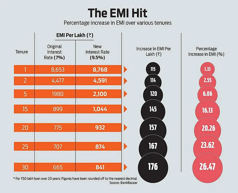 Our calculation shows a similar increase in the EMI. The EMI for a Rs 50 lakh home loan at 7 per cent floating rate of interest, taken over a period of 20 years, will go up to Rs 46,607 from Rs 38,764, adding the 2.5 per cent hike in interest rates (9.5 per cent) in tandem with the repo rate rise. This translates into an increase of 20.22 per cent in EMI outgo per month.