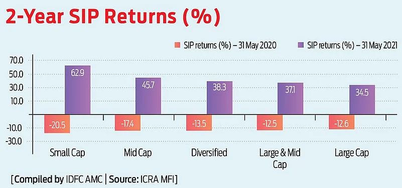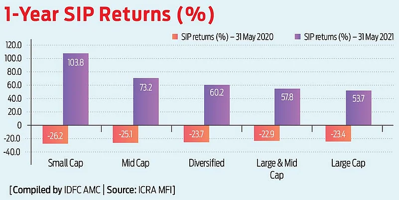 Among SIPs, small-cap index (S&P BSE Small-Cap) delivered the highest one-year returns at 104 per cent. The handsome return, when compared to the lows of March 2020, has pushed the index to be among the highest performers. One-year delta returns have also improved the SIP returns over two and three years.