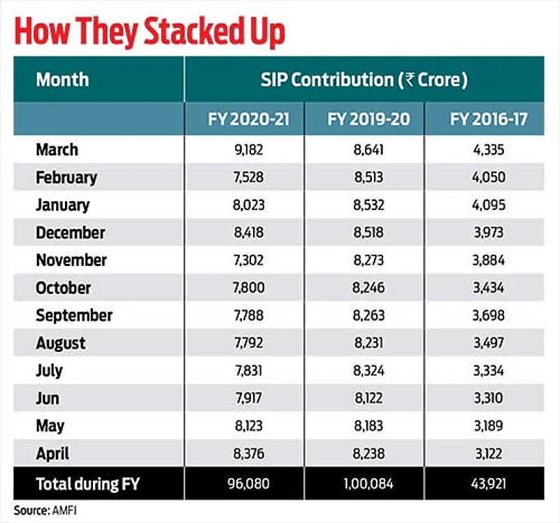 Funds collected under SIPs more than doubled to Rs 96,080 crore in 2020-21 from Rs 43,921 crore in 2016-17. Also, the monthly SIP contribution recorded a healthy growth of 2.52 times to Rs 8,819 crore in May 2021, as against Rs 3,497 crore in August 2016. Between January and June this year, SIPs contributed more than Rs 50,000 crore. The number of new SIPs registered every month saw a near-three-fold rise to 15.48 lakh in May 2021 from 5.88 lakh registered in April 2016.