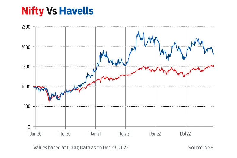 Havells has reported strong revenue, earning a CAGR of 14-15 per cent over FY12-22, with double-digit Ebitda margin of 11-13 per cent. However, its recent performance in Q2FY23, was negatively impacted by high-cost inventory, leading to a fall in gross margin. In addition, advertisement expenses climbed back to pre-Covid levels that led to Ebitda margin falling to a multi-year low at 7.8 per cent.