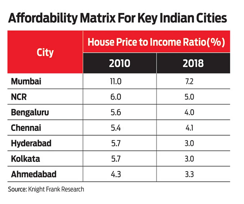 As per the research, the house price to income ratio was as high as 11 in Mumbai Metropolitan Region (MMR) in 2010, which means a family had to shell out 11 times its annual earnings for an apartment. This ratio is high at 6 and 5.6 times for NCR and Bengaluru.