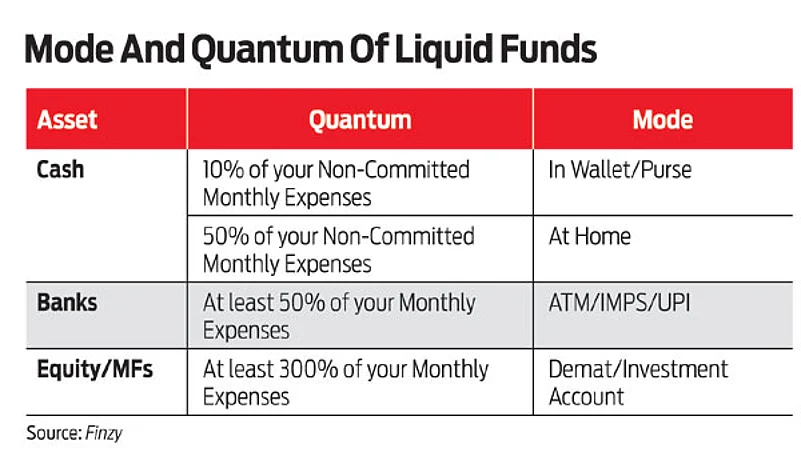 Here is the mode and quantum of liquid funds that one must have access to in order to feel monetarily secure about unplanned situations.