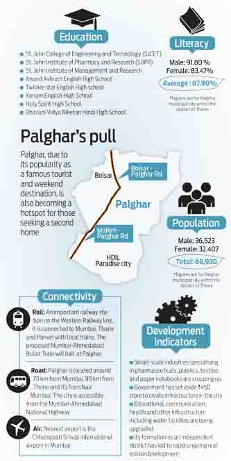 As a district, Palghar covers eight talukas—Palghar, Jawahar, Mokhada, Talasari, Vasai, Wada, Dahanu and Vikramgad. Palghar is the first developed locality after Virar, and is looking at rapid infrastructure development. The state government has set aside Rs 450 crore to create new infrastructure in the city. Education, healthcare and telecom sectors, along with utilities, are being upgraded. Besides, the nearby Boisar area in Mumbai Metrolpolitan Region (MMR) is witnessing rapid real estate development.