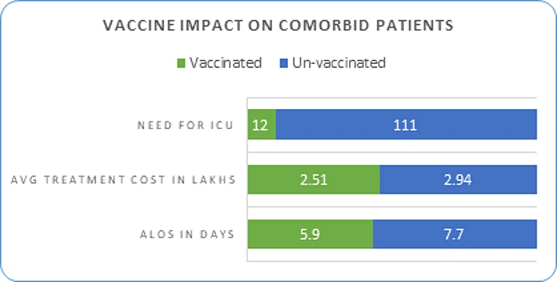 The cohort study surveyed customers of Star Health and Allied Insurance Company who were admitted for Covid-19 treatment in 1,104 hospitals across the country and found that the ALOS, need for ICU and reduction in costs holds for patients with comorbidities as well. While the need for ICU for patients with comorbidities fell from a whopping 9.4 per cent to 5 per cent amongst those vaccinated, the treatment cost also reduced by nearly 15 per cent.