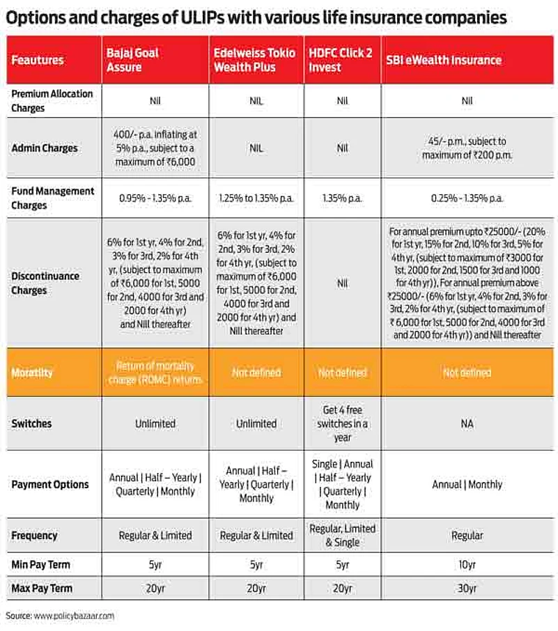 Today, there are two types of ULIPs available. First, in case of death of the policyholder, the life insurance company will pay the sum assured or accumulated fund value whichever is higher to the dependents. Second, the dependent will receive both - the sum assured and also the accumulated fund value. When it comes to charges like the post cap on charge and reduction on yield guidelines, they have gone down drastically. The existing charges under this product category are minimum giving significant liquidity to the customers. Sunil Sharma, Appointed Actuary and Chief Risk Officer, Kotak Mahindra Life Insurance, said, “While all charges have maximum limits capped by the regulator and also because an overall cap (reduction in yield) has been defined, it is still prudent to compare the available options and then make a decision. Key important charges to check are - premium allocation charge, policy administration charge and fund management charge.” (See the Table: Options and Charges of ULIPs with various life insurance companies)