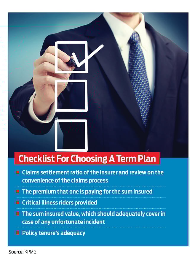 This rider kicks in if the assured becomes permanently disabled due to an accident as all accidents does not always result in death. If the life assured becomes permanently disabled in an accident, then she is paid the sum assured Gayathri says the key aspects to look for when choosing a term plan are -- the claims settlement ratio of the insurer and review on the convenience of the claims process, the premium that one is paying for the sum insured, the critical illness riders provided, the sum insured value, which should adequately cover in case of any unfortunate incident and the adequacy of the policy tenure.
