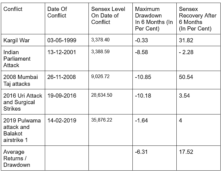 D-Street has typically responded to Indo-Pak conflicts negatively since 1999. On average the Sensex and the Nifty have declined 6.31 per cent and 5.57 per cent respectively during times of conflict as can be seen in the tables below.