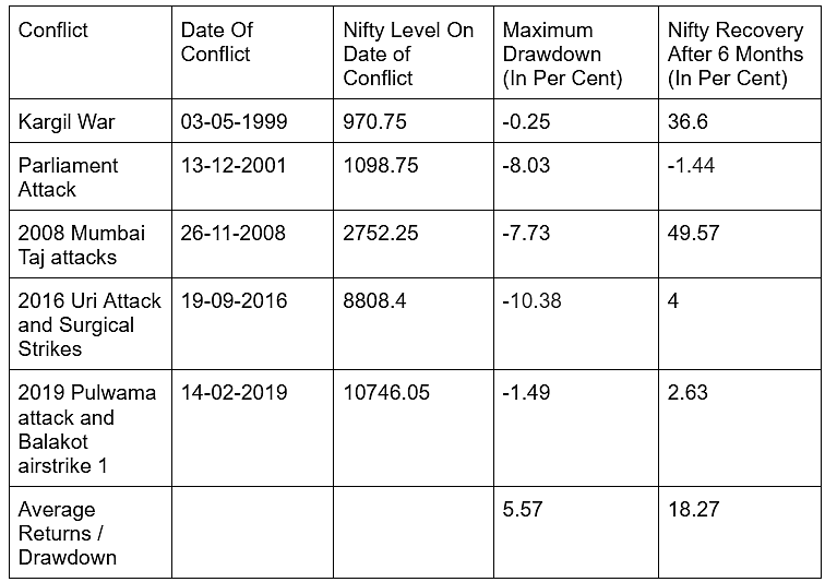The Kargil war began on May 3, 1999. The Sensex and the Nifty traded at 3,378.40 level and 970.75 level respectively on May 3. The headline indices witnessed a maximum drop of as much as 0.33 per cent in the six-month period after the war began. However in the six month period following the war the Sensex and the Nifty managed to rebound up to 36.6 per cent.