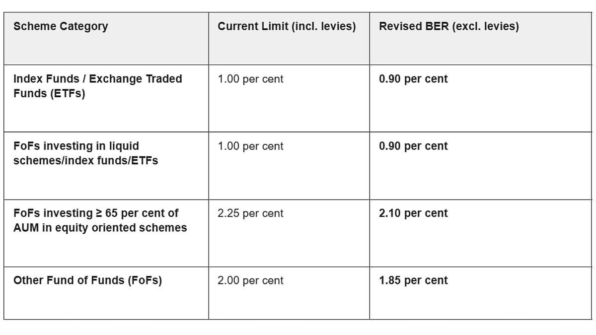 The market regulator has also introduced changes to make investment in mutual funds more affordable. Sebi has revised the maximum limit of the expenses charged to investors. For index funds and ETFs and Fund of Funds investing in liquid schemes, the limit has been reduced by 10 basis points (bps). On the other hand the limit has been reduced by 15 bps for FoFs investing more than 65 per cent of their AUM in equity oriented schemes and other FoF schemes. The market regulator has mandated that the BER for open-ended schemes will be determined on the basis of the scheme's Assets Under Management for equity oriented and other open ended schemes.