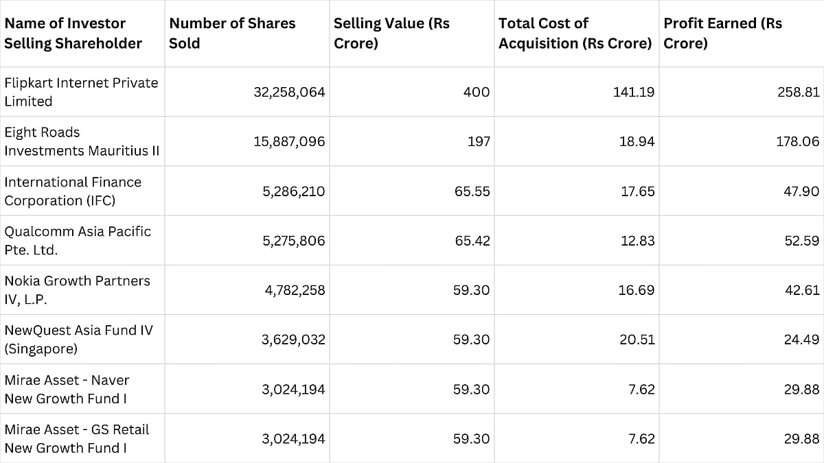 International Finance Corporation is set to sell 19.637 million shares for Rs 65.549 crore, resulting in a paper profit of Rs 47.90 crore. Other selling shareholders, such as Qualcomm Asia Pacific Pte, Nokia Growth Partners IV, and NewQuest Asia Fund IV are set to make profits of Rs 52.59 crore, Rs 42.61 crore, and Rs 24.49 crore, respectively. Additionally, Mirae Asset - Naver New Growth Fund I and Mirae Asset - GS Retail New Growth Fund I are set to gain Rs 29.88 crore each from their share sale.
