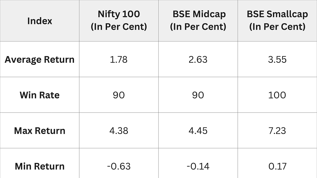 Smallcap stocks lead performance with 100 per cent win rates, yielding average returns of 3.55 per cent in this window.