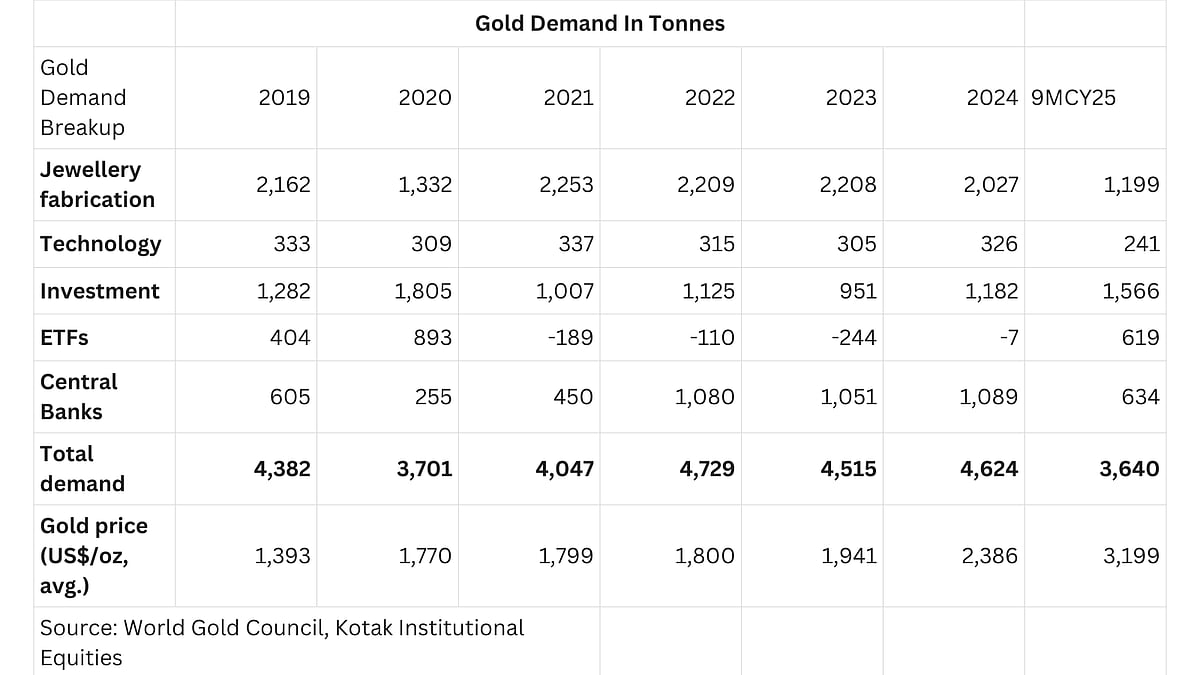 Additionally the demand for gold has been driven by jewellery fabrication in the period between 2019 and 2025. For the nine-month period ended September 30, 2025 the volume of demand for gold jewellery moderated to 1,199 tonnes compared to 2027 tonnes in the previous year. However, gold jewellery continued to drive demand as demand from other segments such as technology, investment, Exchange Traded Funds and Central Banks continued to remain relatively lower.