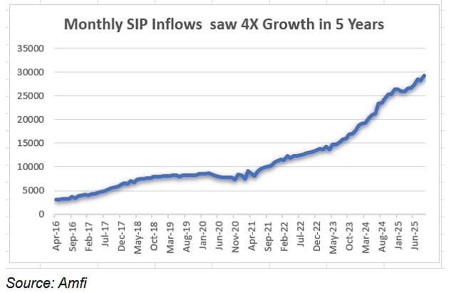 Thanks to this convenience, SIP inflows have been rising steadily over the years. In fact, SIP inflows for September 2025 were 20 per cent higher than those in the same month last year. The inflows through the SIP route have grown five times since September 2020 — from Rs 7,788 crore to Rs 29,361 crore in September 2025.