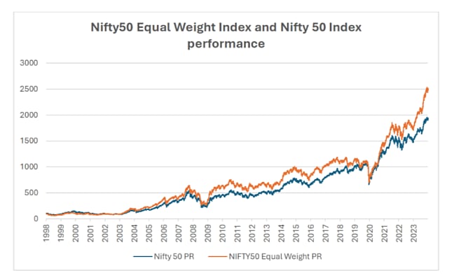 Given this backdrop, when we compare the performance of the two indices over the long term or even the short term, the Nifty 50 Equal Weight Index has outperformed the Nifty 50 Index consistently.