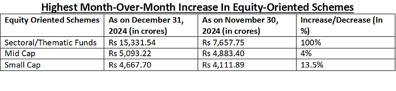 Jatinder Pal Singh, CEO, ITI Mutual Fund, describes the reason for this strong inflow in equities, “Despite muted equity market performance during December 2024, inflows in open-ended equity funds stayed in the positive zone for the 46th month in a row. Gross Inflows into active equity schemes were up 17 per cent in Dec 2024 compared to the previous month. This increase can be attributed to the 70 per cent absolute growth in gross inflows into sectoral/thematic equity schemes, most of which can be attributed to NFOs. Inflows in the large-cap category were down by 8 per cent month on month while net flows were down 21 per cent compared to November 2024”.