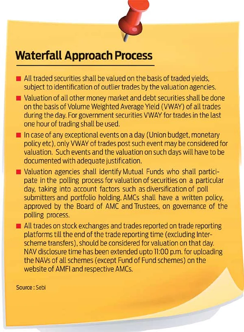 Sebi aims to make debt funds more consistent and transparent under the “waterfall approach.” So that during any credit event, all funds can value their securities along similar lines. The waterfall approach is a step-by-step method implemented to arrive at a security level pricing, during the valuation of debt and money market securities. The reason it is named so because it reflects the flow of specified valuation methods to be followed, in that particular sequence.