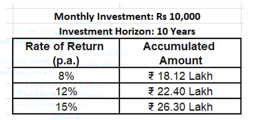 The higher the returns, the more money an investor will be able to accumulate in a given time period. Suppose an investor invests Rs 10,000 per month for 10 years. The table below shows how much he would earn in 10 years with different rates of return. So, at the rate of 8 per cent, he will accumulate Rs 18.12 lakh. At a higher rate of return of 12 per cent, he will accumulate Rs 22.40 lakh, and at 15 per cent returns, you would be able to accumulate Rs 26.30 lakh.