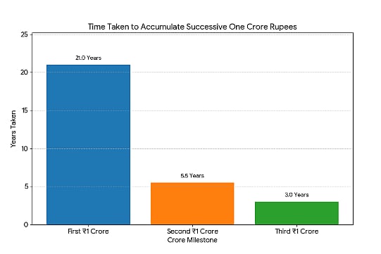 And so on…Notice the pattern here. To create the first 1 crore, it took 20 years, but after that, for every additional crore, it took significantly less time.