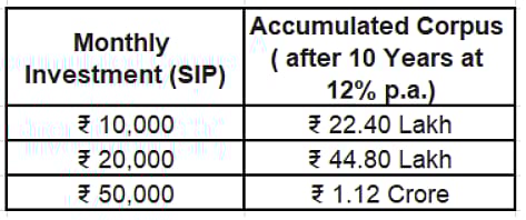 So, with a Rs 10,000 monthly investment for 10 years, the corpus built is Rs 22.40 lakh. Doubling the monthly investment to Rs 20,000 doubles the corpus as well to Rs 44.80 lakh. Increase the monthly investment to Rs 50,000, and you can become a crorepati in 10 years.