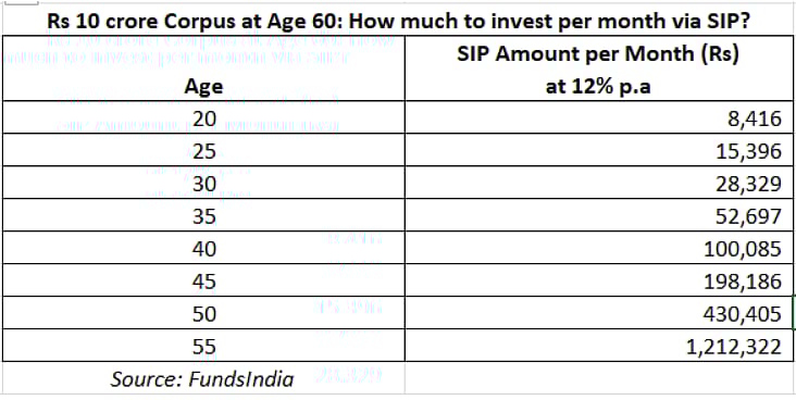 Look at the numbers. If you invest through a systematic investment plan (SIP) and earn around 12 per cent a year over the long term, the monthly amount needed to reach Rs 10 crore by age 60 changes sharply with your starting age.