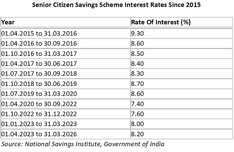 The scheme has been running for over two decades. It was launched in 2004 at 9.00 per cent. Since then, the rates have traversed from the highest 9.30 per cent to the lowest 7.40 per cent to the current 8.2 per cent. Here is the historical interest rate of the SCSS scheme.