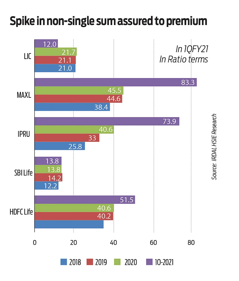 Term insurance being a traditional product has a higher sum assured per rupee of premium paid by the consumer. This means higher the ratio higher is the sale of the term product. Savings-linked insurance products, on the other hand, have a lower sum assured per rupee of premium. As per research, the ongoing pandemic is expected to reset mindsets in terms of the importance of life insurance as a risk cover rather than a savings-linked investment product. This, according to experts, also means demand for protection products is likely to gain further momentum.