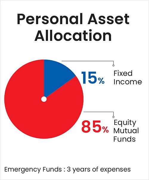 Around 85 per cent of my portfolio is allocated to equity mutual funds, with the balance in fixed income instruments. I believe in keeping at least three years’ worth of expenses in non-equity and low-volatility assets like fixed income, to ensure more stability and liquidity for near-term requirements.