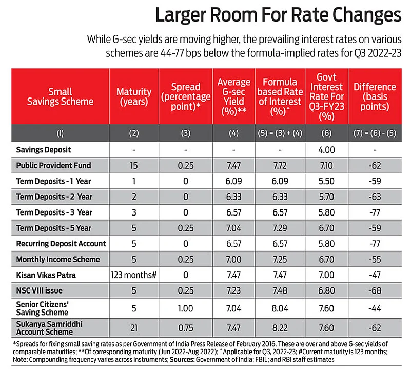 For instance, the spread on Senior Citizens’ Savings Scheme (SCSS) will be 100 bps over G-secs of comparable maturity. However, though the rates are reviewed and communicated every quarter, it is not followed strictly.