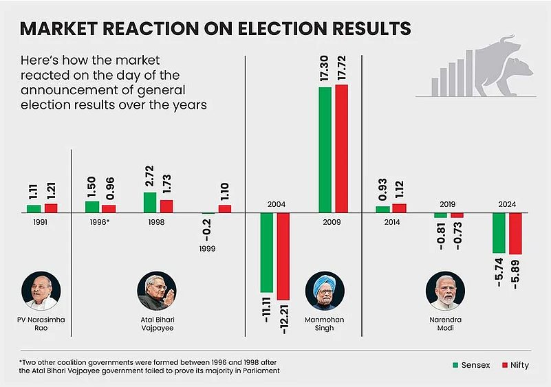 On June 1, 2024, most pollsters had predicted a strong win for the BJP-led NDA in the 2024 general elections. On the back of this prediction, on June 3, the major Indian stock market indices, the BSE Sensex and Nifty, scaled new highs. The Sensex touched 76,468 points, while the Nifty was at 23,263, up by 3.30 per cent and 3.25 per cent, respectively. That day, the Sensex closed above the 76,000-mark for the first time in its history.