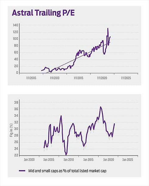 Another aspect of the stocks that successfully transition from small cap to large cap is a change in their valuation or P/E re-rating along the way. As the client pool of the investors in these stocks shifts from retail to HNI and then domestic institutional investors (DII) and lastly foreign institutions, the return, and growth expectation of each category of investor’s edge downwards. An HNI would settle for nothing less than 20-25 per cent returns given his opportunity as well as capital costs. The DII may be happy with 15-18 per cent while the FIIs who are comparing global opportunities and dirt cheap global interest rates may well be happy with 10 per cent returns. This leads to the buyer being willing to pay higher prices and hence higher PE multiples, pushing the stock valuations up. Astral, a pipe and adhesive manufacturer from Gujarat is one such brilliant name that transitioned from a small cap to a large cap in recent years, multiplying investors’ wealth by 400 times along the way. Its PE went from a 10X earnings at the beginning of the decade to 100X trailing earnings currently. During the same period, FII holding moved up from a measly 1 per cent to 23 per cent.