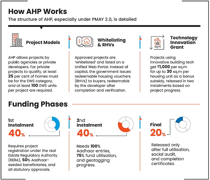 AHP: Within the government’s housing framework, the AHP vertical was meant to fix the supply-side failure. Launched as part of PMAY-Urban, this model encourages states to partner with private developers or public agencies to build group housing projects, of which at least 25 per cent of the homes are earmarked for EWS beneficiaries (under 45 sq.m carpet area).