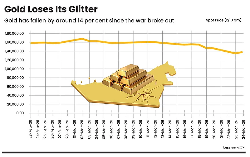 The recent fall in gold, which is traditionally seen as a safe haven asset, is a striking market paradox. Typically, the current situation—a full-blown geopolitical shock, tensions around Iran, risks to the Strait of Hormuz, oil around $100 per barrel, and equities under pressure—would favour gold, yet the metal has dropped sharply. Gold has tumbled around 14 per cent since the start of the war.