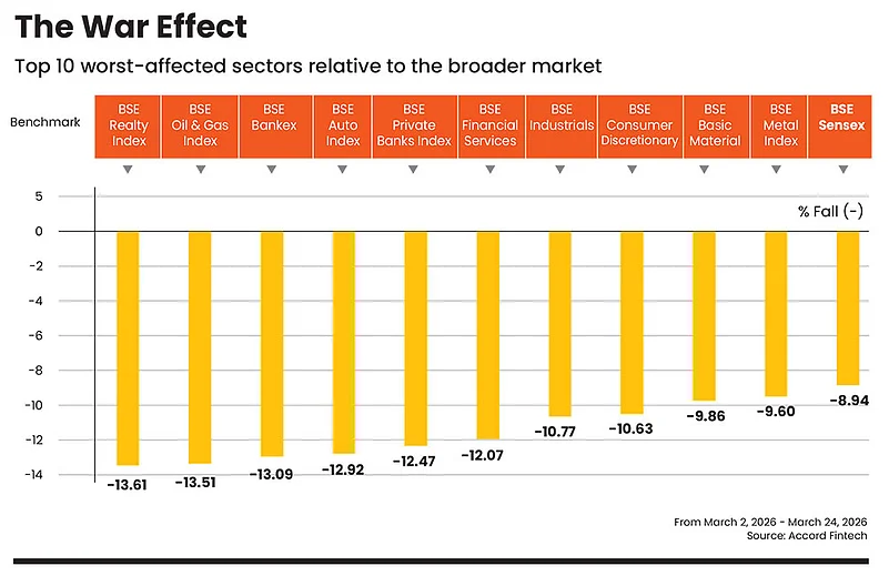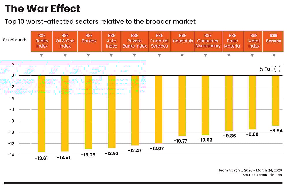The ongoing geopolitical conflict has triggered a sharp and broad-based correction across sectors, with cyclical and rate-sensitive sectors bearing the brunt of the sell-off. Data shows that key indices such as the BSE Auto (-12.92 per cent), Bankex (-13.09 per cent), and Oil & Gas (-13.51 per cent) have fallen more than the broader market BSE Sensex, which fell nearly 9 per cent.