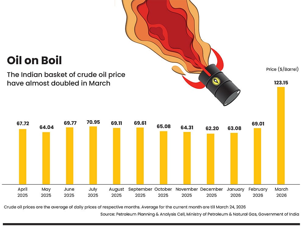 At the heart of the economic disruption is oil. As on March 24, the brent crude price was hovering in the range of $100-105 per barrel in the international market. However, the actual price for India is much higher, considering transportation and other logistics cost. According to Petroleum Planning and Analysis Cell data, the International prices for crude oil (Indian Basket) is $123.15 per barrel in March, almost double compared to the $69.01 per barrel in February 2026.