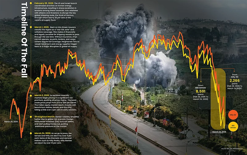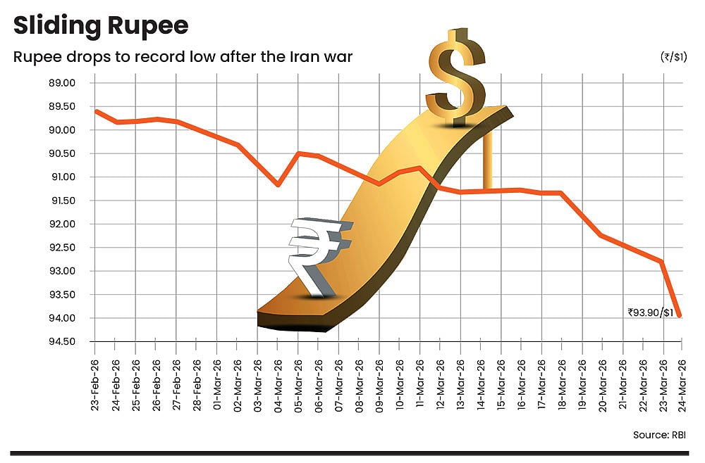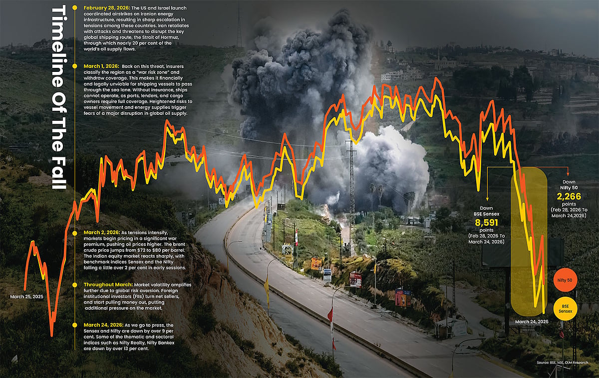 The war involving the US, Israel and Iran in the Middle East, which may be moving towards a ceasefire with the US and Iran negotiating a deal till the filing of this report, triggered one of the most severe geopolitical shocks in recent years for global markets and economies. Oil prices soared, currencies tumbled, and equity markets went into a tizzy. The benchmark index tumbled 9 per cent, crude oil jumped over $100 per barrel, and the rupee touched an all-time low of Rs 93.90 against the US dollar, as on March 24, 2026.