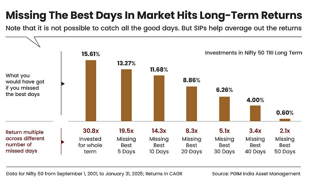 How does that happen? “The best days of returns come after the days when markets stumble the most,” says Abhishek Tiwari, CEO, PGIM India Asset Management. Since 2001, Tiwari explains, some of the market’s best days (regarding daily returns) occurred either during a correction phase or shortly after that. “It’s intuitive to think that markets bounce back stronger after a downturn,” he adds.