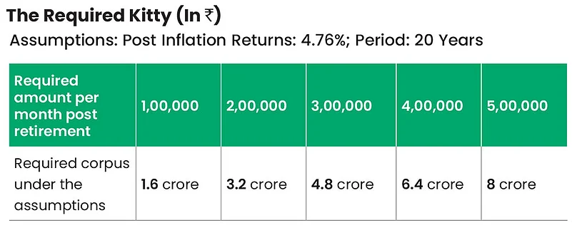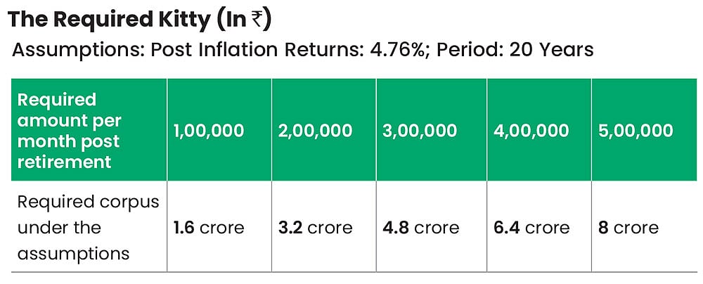 The estimation of corpus is the amount that would give you Rs 3 lakh per month, for 20 years, when the amount invested earns 4.76 per cent per year. Under these assumptions, that corpus is around Rs 4.80 crore. For a requirement of Rs 1 lakh per month during your retired life, the corpus is around Rs 1.60 crore and for Rs 5 lakh per month, it is nearly Rs 8 crore.