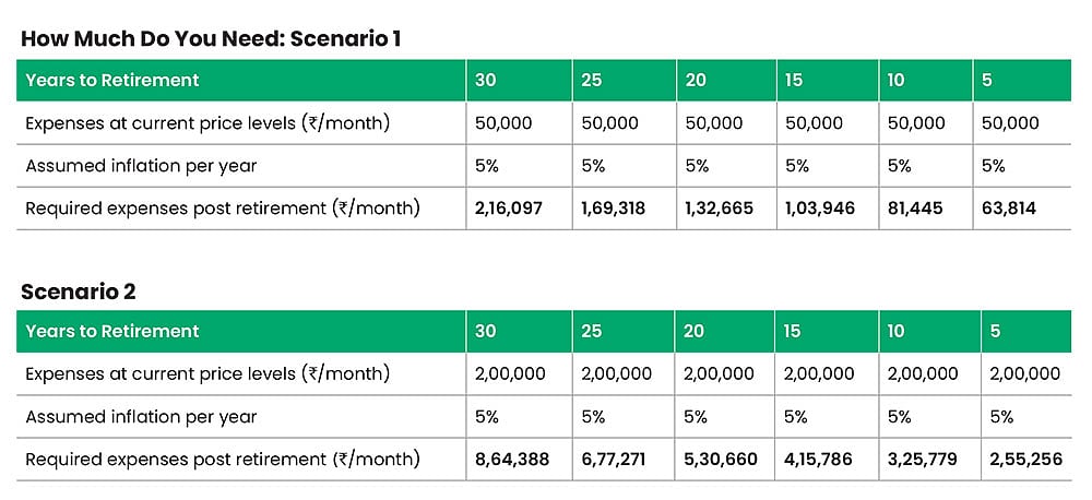 This is a function of your current expenses, your estimate of expenses post retirement and inflation for the years remaining up to your retirement. It is a common perception that after retirement, expenses would move up due to medical expenses, apart from inflation. However, certain lifestyle expenses tend to cool down after retirement. Today, you may desire a fancy car or a fancy phone. With maturity, just a car to travel or a less expensive phone would suffice. You may like to visit clubs or eat out today, but in your golden years, you might become more sedate. You may have EMIs today, but that will be repaid in due course.