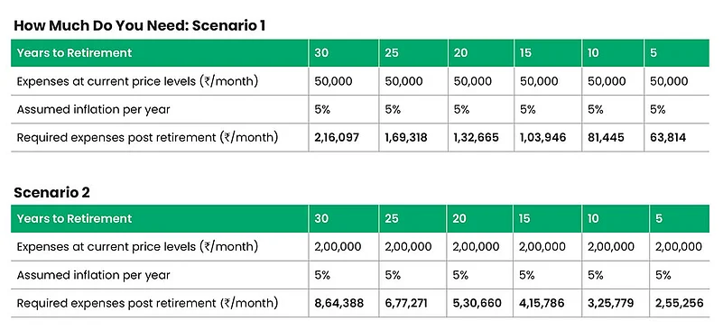 Let us take an example. Your current expenses—the usual, regular expenses and not the EMIs or sudden expenses—are Rs 50,000 per month. Let us assume inflation at 5 per cent per year. If you have 10 years to go for retirement, due to inflation over 10 years, your expenses become Rs 81,445 per month. If you have 20 years to go for retirement, it becomes Rs 1,32,665 per month due to inflation. If your expenses are Rs 2 lakh per month, on the same assumptions, it becomes Rs 3,25,779 after 10 years and Rs 5,30,660 after 20 years.